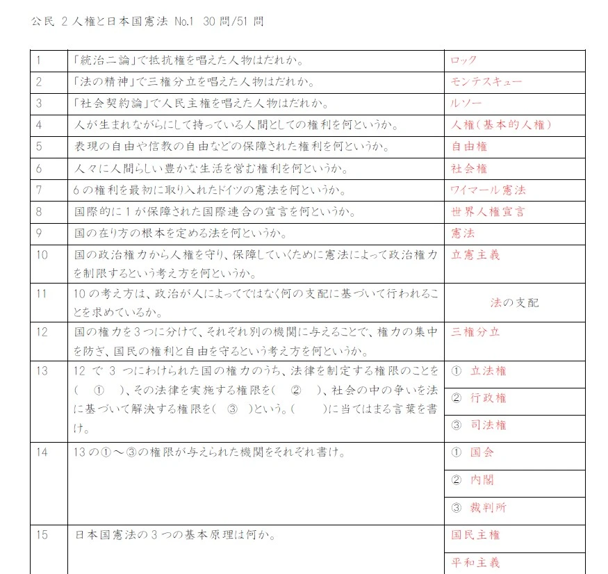 指導の手順は、あらかじめ覚えておいてほしい一問一答プリントを配布し、その次の回の授業までに暗記することを宿題にします。 次の指導日の初めに、ミニテストを行うことで、暗記の動機付けを行いました。 授業中は、その範囲内の演習問題を解き、答え合わせと解説をしました。