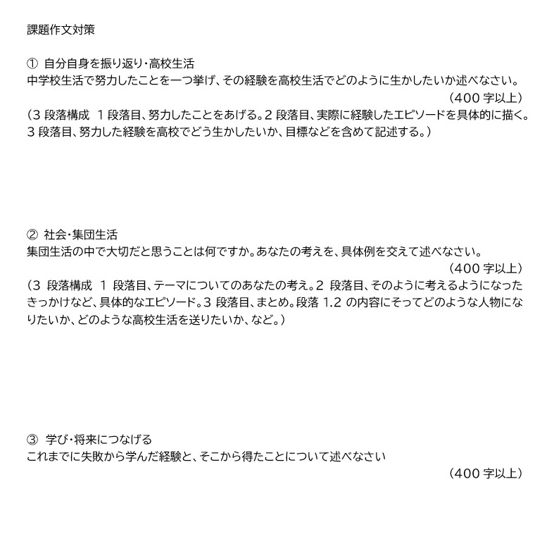 受験が終わった生徒は、「作文形式が昨年までの過去問とは違ってましたが、とくに焦ることなく記述することができました。 それよりもグループ面接時にほかの人のほうが自分よりもしっかりと答えられているように感じました。」と感想を述べていました。