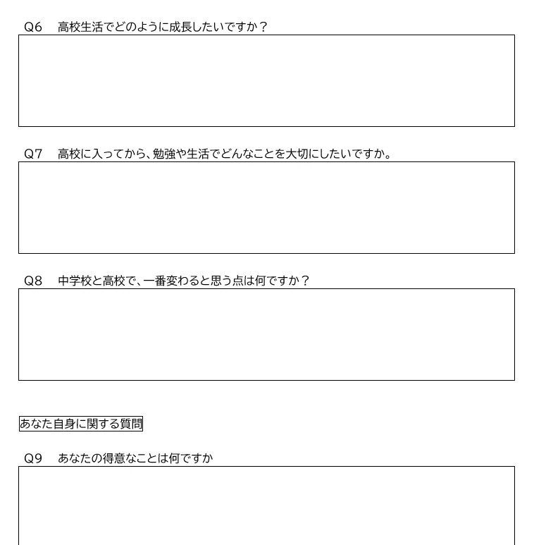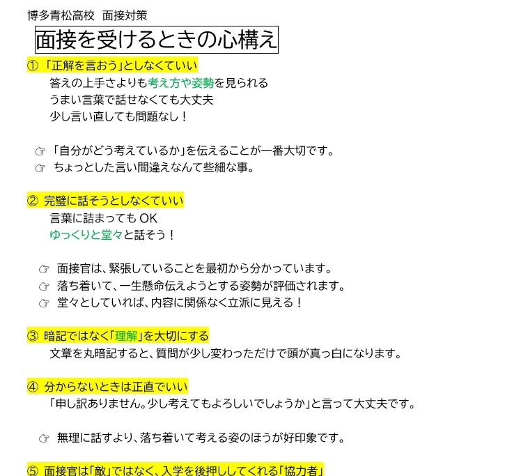 それから、面接でよく聞かれる30項目の質問を記載したプリントを配布し、その解答の記述を宿題にして、それをベースに面接の練習を繰り返しました。 また、あわせて過去の博多青松高校や他の公立高校の推薦入試の面接試験の問題を組み合わせながら、予期せぬ質問にも対応できるように対策を行いました。